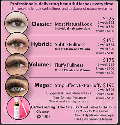 Our qualified lash technicians apply a complete set of luxury eyelash extensions. We do not count lashes and will add as many (all eyelashes lashed) or as few as you would like to create the right look for your face and style.